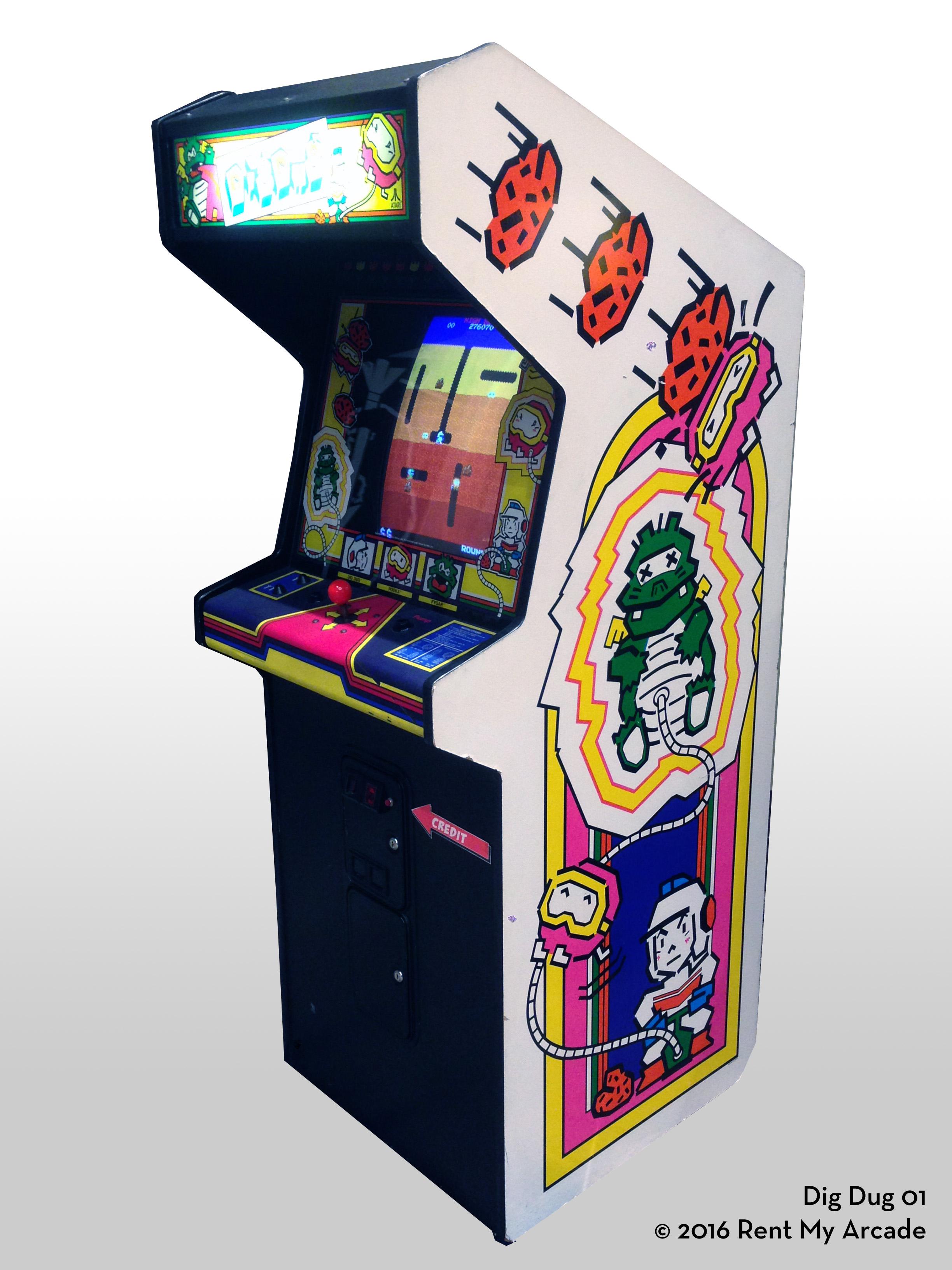 Dig Dug is an exciting new type of maze game. Now players create their own mazes by controlling "Dig Dug", a dauntless miner who feverishly digs tunnels to dodge or destroy the precocious "Pooka" or the ferocious "Fygar". and to collect veggie treasures.