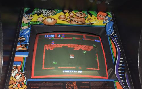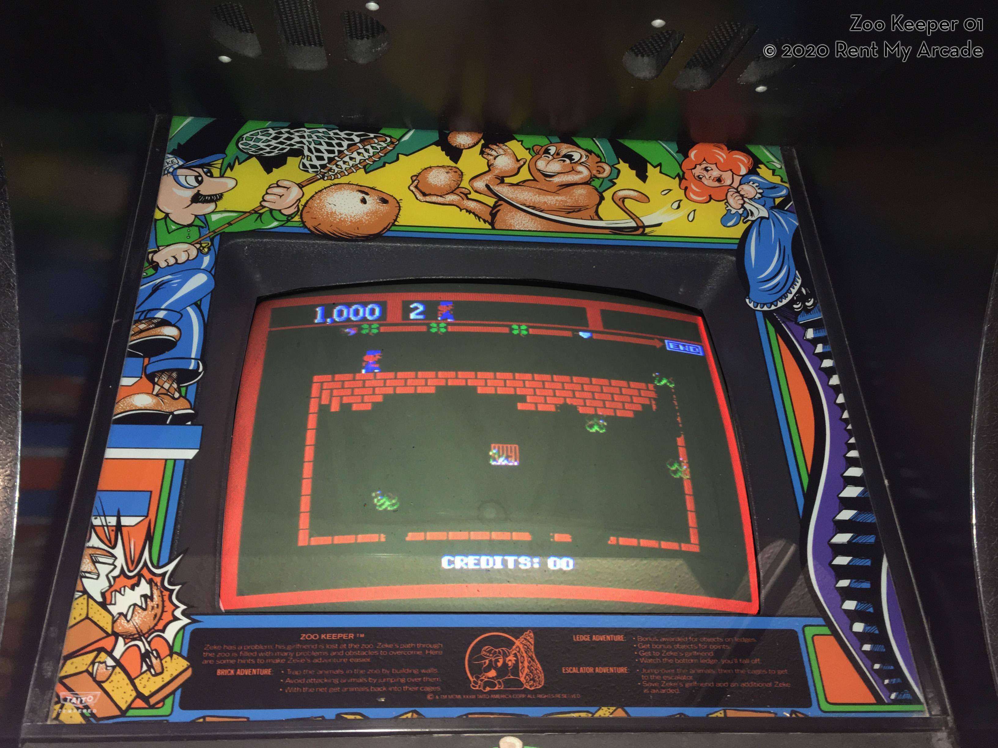 And it’s no wonder, players find out right off that it’s a zoo in there… and the animals are eating their way out! Wherever Zeke the zoo keeper runs along the wall, he replaces bricks which have been chomped away. But the animals are swift and some inevitably escape. Now Zeke has to dodge or jump over them to survive – while still frantically trying to rebuild the bricks. Plus, he’s trying to earn bonus points by grabbing watermelons, root beers, and other goodies along the way. And all the while the time fuse is burning!